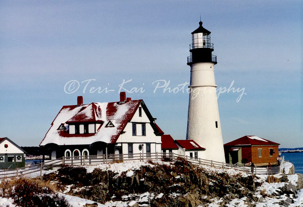 "Sunset Serenity at Portland Head" presents Portland Head Light standing resolute on Cape Elizabeth’s rocky promontory as a warm band of sunset slips beneath heavy, moody clouds. The composition contrasts the jagged texture of the foreground granite with the smooth sweep of Casco Bay.