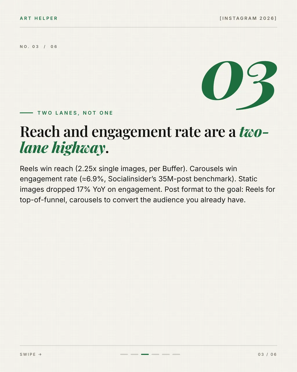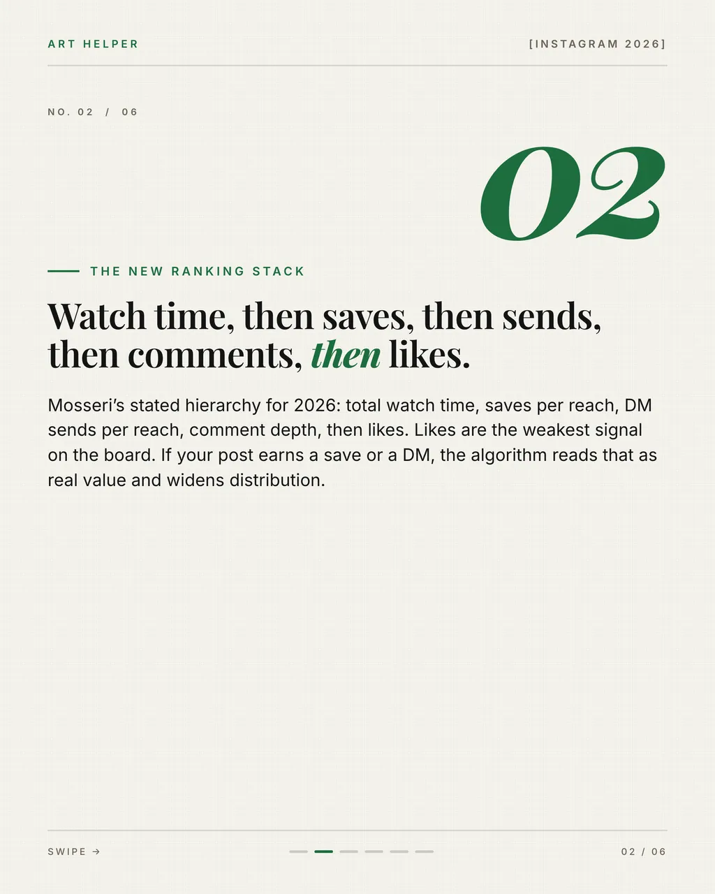 Mosseri's stated ranking order now goes watch time → saves → DM sends → comment depth → likes. Likes are the weakest signal on the board. Reels win reach (2.25x single images, per Buffer's 45M-post study). Carousels win engagement rate (~6.9%, Socialinsider). Static images dropped 17% YoY.