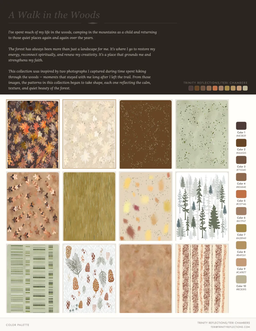 Für diese Kollektion habe ich mit ein paar Bildern angefangen, die ich beim Wandern im Wald aufgenommen habe. Aus diesen habe ich eine Farbpalette gezogen und ein Set von Mustern entwickelt, die von den Texturen, Farben und dem Gefühl dieser Umgebung inspiriert sind.