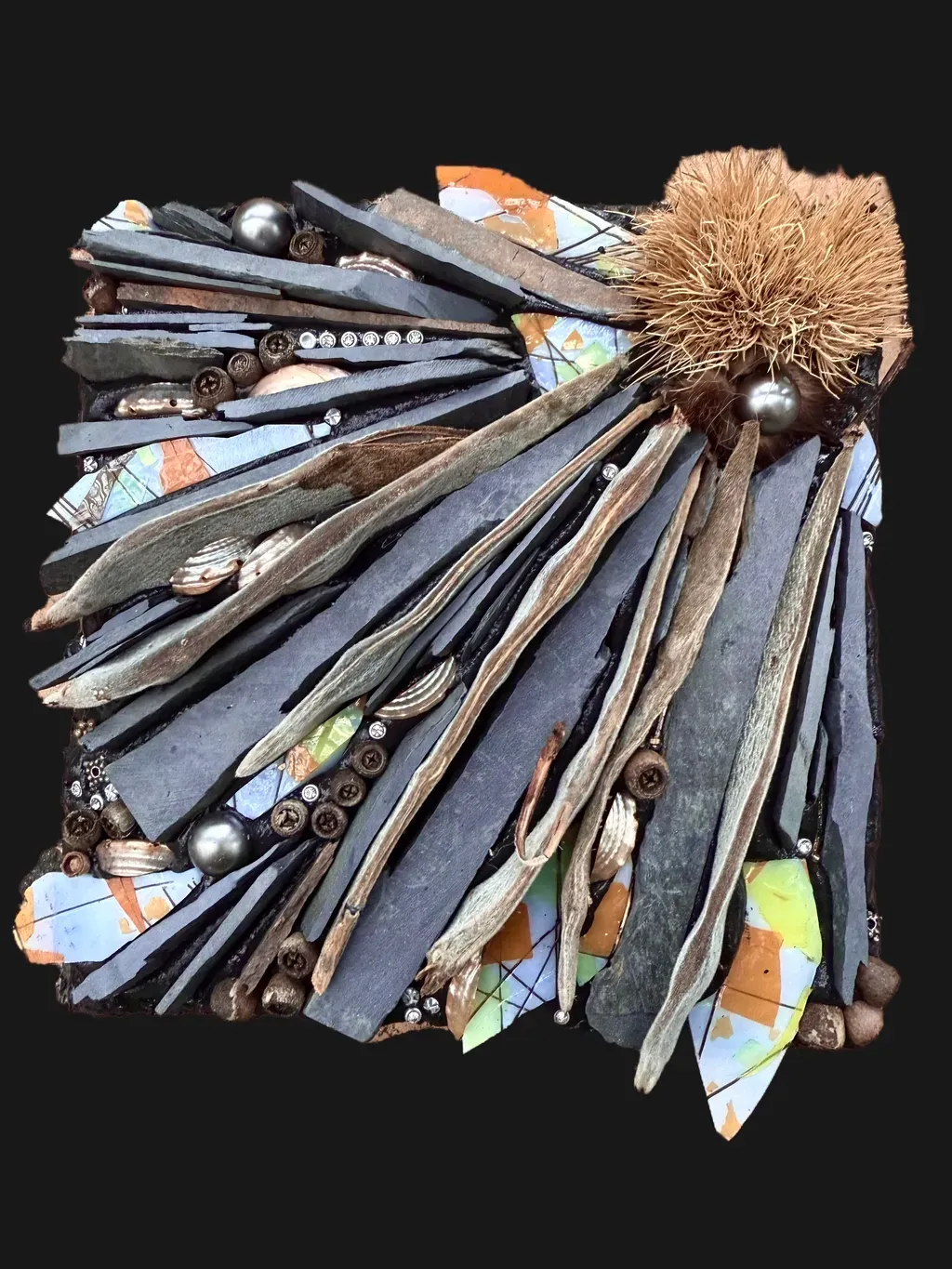 How does nature inspire you to create a work around her as a muse? This mixed media piece, "Gathered Radiance" has slivered pods from one of my trees beside my folly, which is my artspace, sitting next to Fishhawk Creek, my lovely country property in the coastal range of Oregon. Combined with this pointy "poof" of nature, acting as a sun with the rays created from the pods, small dried seeds, slate and bright colored glass. I also used re-purposed jewelry. (I'm big on that form of re-cycling)! Let's see what you use from real nature-inspired pieces!