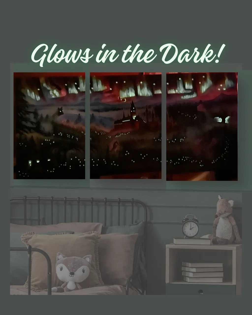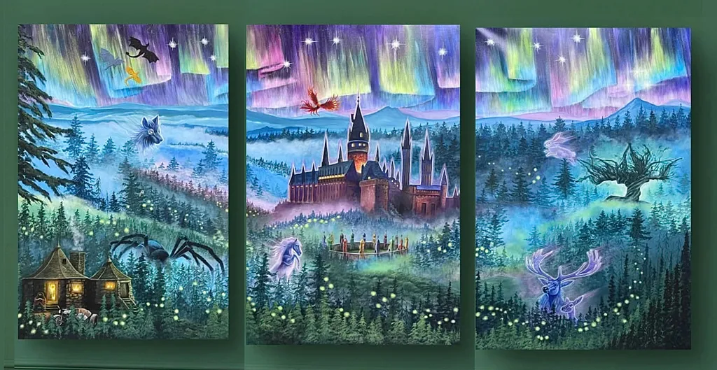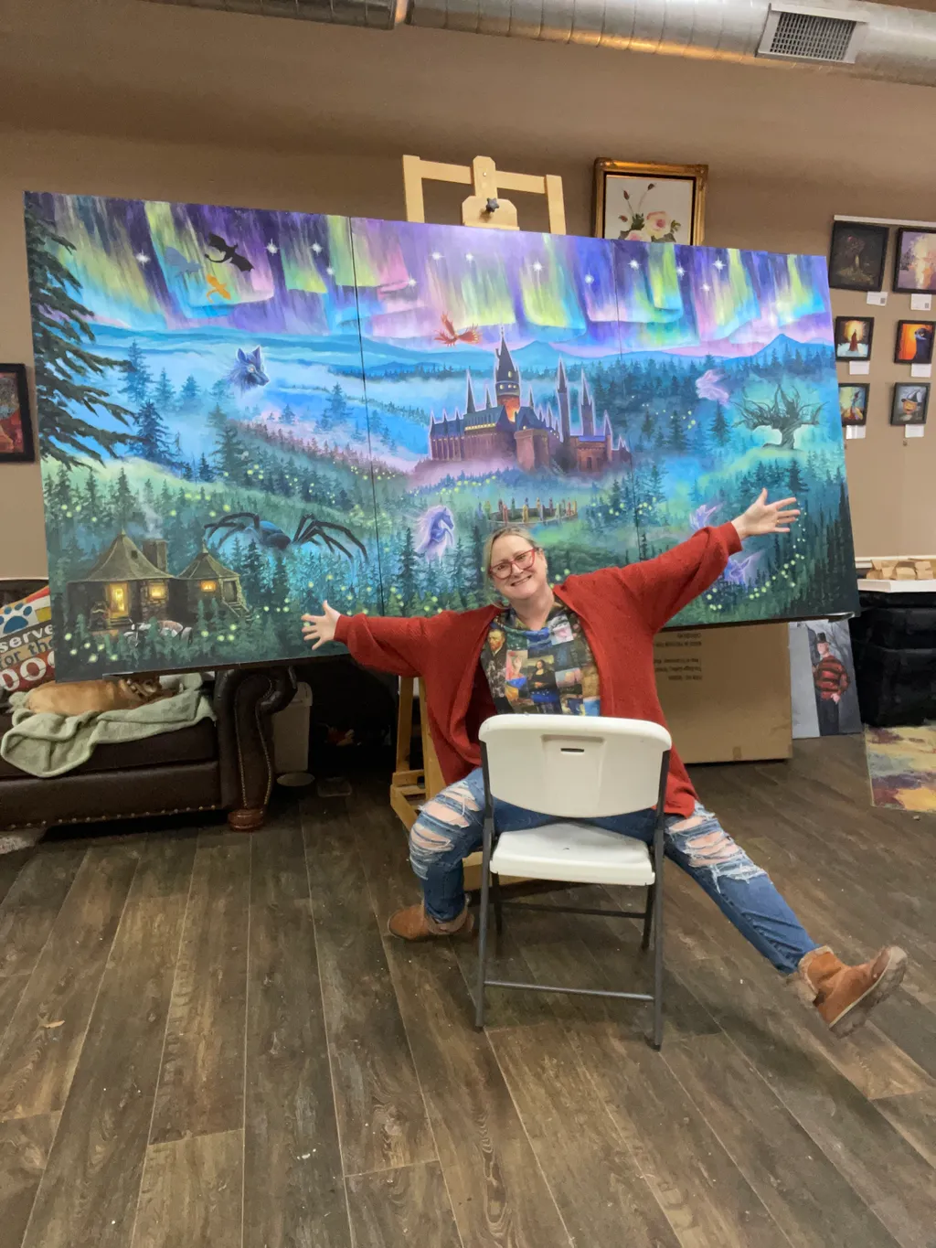 This was a commission piece for a salon owner, who had been looking for a while for an artist to execute her vision. I was really excited that she trusted me to create this Harry Potter inspired three panel, large painting. She had many elements that she wanted included, which I was able to do plus a few extras as surprises. It is in her massage room where she works.