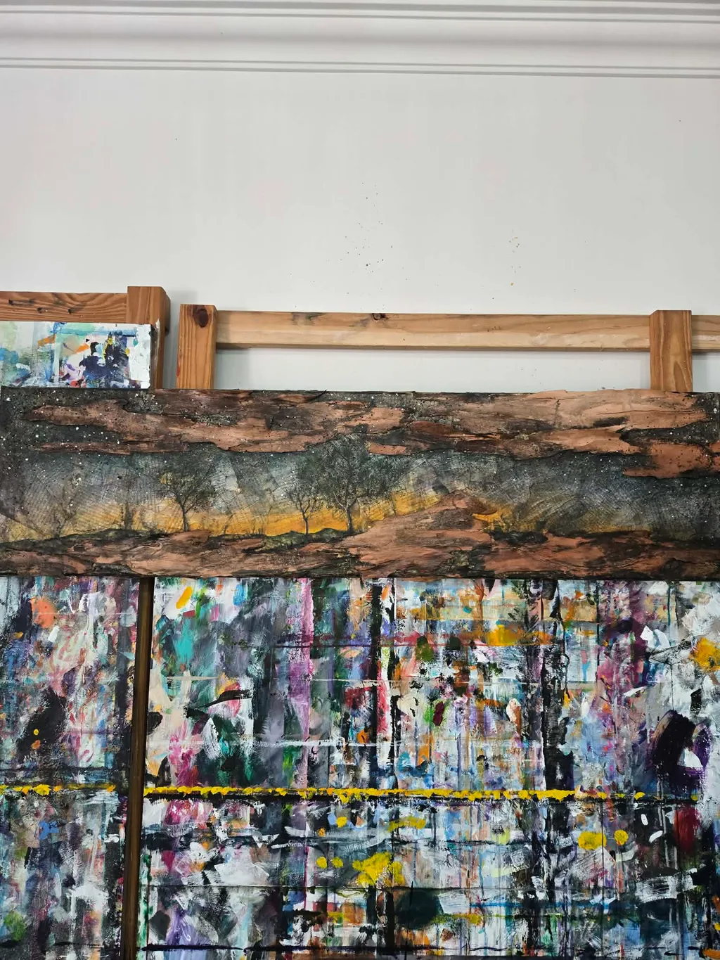 Built on a foundation of crime story pages, this canvas carries fragments of human narrative beneath the surface. Acrylic paint is layered over the top, while pieces of natural Australian bark are embedded into the work -