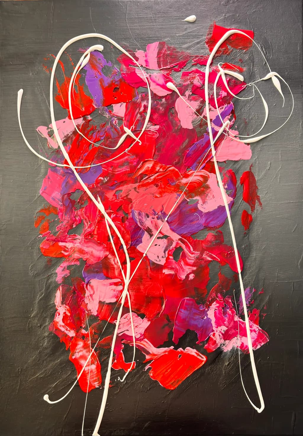 “El cuerpo siente. El color desborda. En este conjunto particular de obras, ella explora la transformación entre el interior y el exterior. El primer lienzo revela la silueta emocional—líneas blancas que emergen de una tormenta cromática.