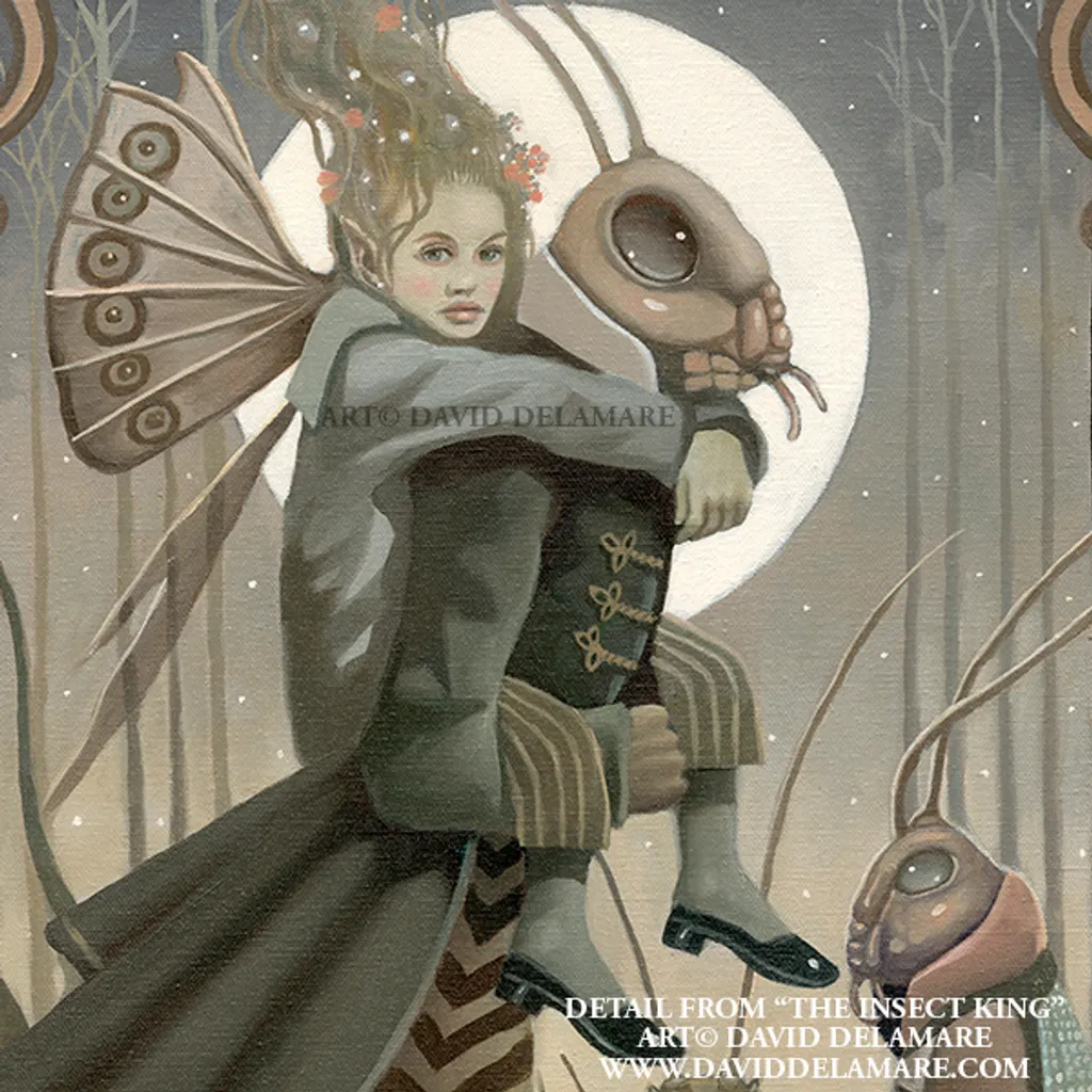 David Delamare comenzó a pintar animales antropomorfizados muy temprano en su carrera. Era natural abordar los insectos de la misma manera. Este es un detalle de la última pintura que produjo antes de fallecer en 2016.