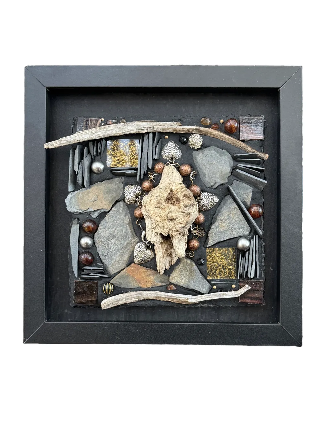 Esto es algo en lo que hice precisamente eso... "Tesoros de la Tierra Arriba y Abajo" no solo tiene hallazgos naturales (gracias, Mamá Naturaleza), sino también algunas joyas donadas y, si miras de cerca, ¡algunos de los cristales de la cubierta del volante 'reutilizados'!