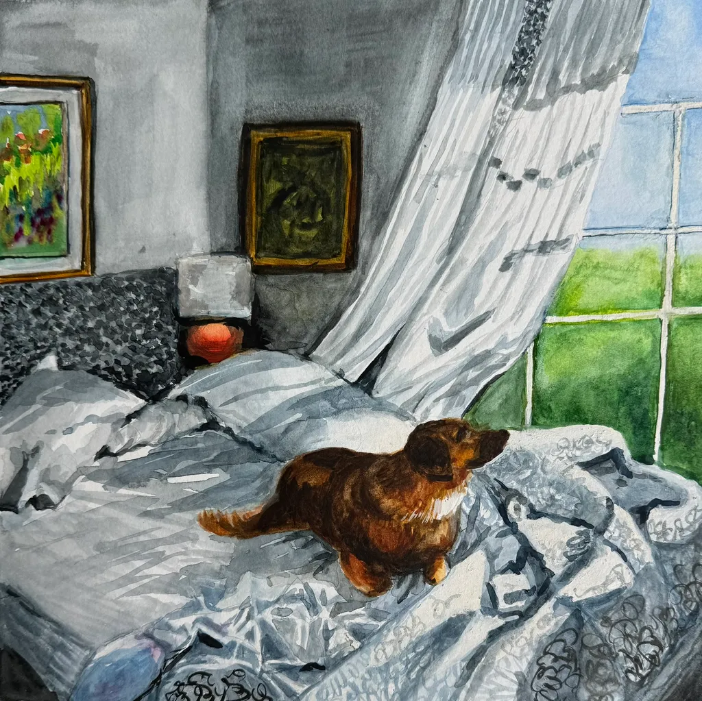 Gus is just the best boy and i love it when he comes in to visit in the bedroom. He doesn't mind a messy bed and he's especially fond of sunbeams. The only thing he likes more is watching birds and whatever is going on outside his window. This is a new watercolor celebrating his last visit.