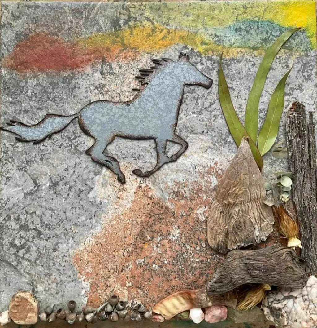 Enquanto cuidava da casa de alguém no Arizona por um curto período, decidi coletar elementos naturais na propriedade dela e, posteriormente, incorporá-los a um azulejo de mídia mista, que presenteei como agradecimento por me dar uma chance de sair do inverno chuvoso de Oregon e desfrutar do clima quente e seco de Cave Creek. O amor dela (e meu) por cavalos foi o principal motivo. Cercar esse cavalo de metal com casca de árvore áspera em tons de cinza, pequenas sementes caídas de uma árvore entre sua casa principal e a hacienda onde eu estava, além de folhas secas no chão, rochas locais tão coloridas que adicionaram profundidade! Um cisto achatado e texturizado e algum tipo de espinho criaram uma oportunidade de trazer elementos wabi-sabi para a peça! O que deu vida a ela foi o trio de folhas verdes pontiagudas e achatadas e aquele pedaço de cacto bege e enrugado, que foram os toques finais. Beleza e verdade na imperfeição.