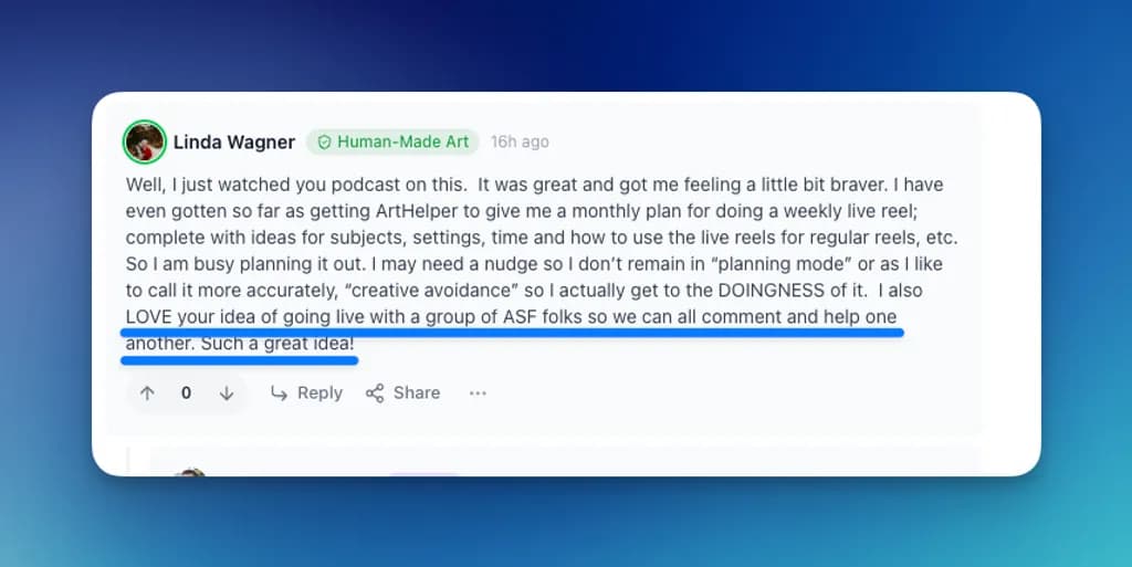 Because of my MS, it’s often hard for me to get my thoughts coherent on paper, and Artie has honestly been a game changer—I’ve been able to post more and still sound like myself. I’m really thankful for the invite and happy to be here in this community, and I’m looking forward to learning and growing together.