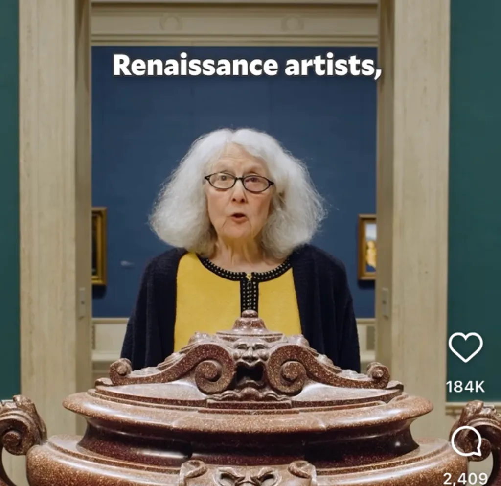 A 77-year-old woman stands behind a 16th-century Florentine urn in the National Gallery of Art, looks straight into the camera, and says: "Haters will say this urn is mid, but they don't know we've clocked its tea."