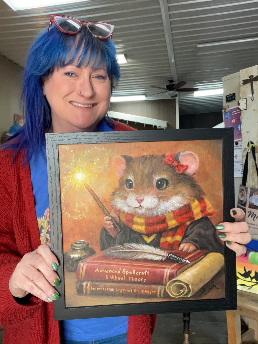 I have a collector who has commissioned Harry Potter inspired critters. She is my business neighbor and has a coffee shop and is hanging them up in her shop. This is my latest piece inspired by Hermione. I’ve also done a Harry Potter hamster, a Dumbledore owl and a Hagrid hamster. This all started when one of my students that I give private lessons to wanted to paint a hammy Potter because she’s obsessed with hamsters.