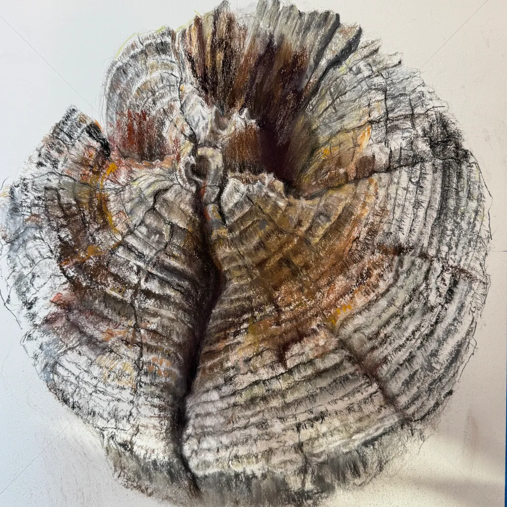Tenho criado uma série de pinturas a pastel inspiradas na beleza e singularidade de cada ponta de galhos ao longo de uma trilha de caminhada. Cada anel conta uma história da vida da árvore. A forma como eles se abrem para mostrar-se ao envelhecer e decair, mas de alguma forma continuam sendo criadores de beleza, me emociona profundamente. Que eu também possa abrir e mostrar minha beleza interior à medida que envelheço.